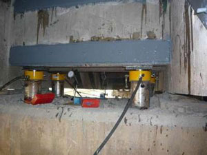 當橋梁整體頂升時,其承載噸位一般達到千噸級別,在如此重載之下,我們要設置千斤頂與墩基的連接結構。為保護我們的千斤頂底座與水泥結構之間的直接磨損,我們需在超薄型液壓千斤頂的底部墊入金屬塊,一方面能夠承受千斤頂與水泥墩之間的整體受力,一方面能防止千斤頂在操作過程的缸體受損。